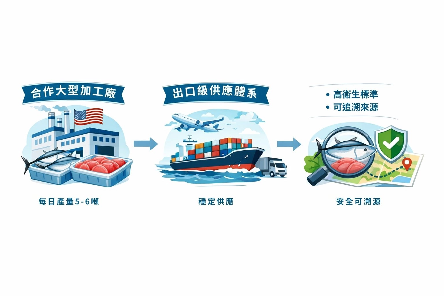 我們與專供外銷美國市場的大型加工廠深度合作,每日產量規模達 5-6 噸