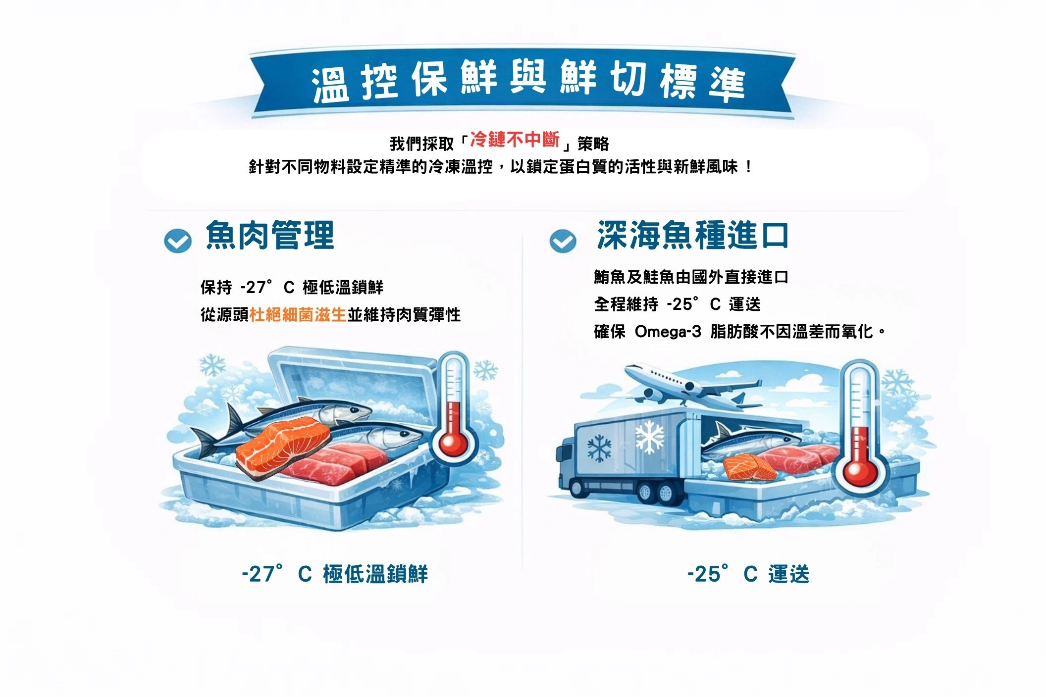 深海魚種進口: 鮪魚及鮭魚由國外直接進口,全程維持 -25°C 運送,確保 Omega-3 脂肪酸不因溫差而氧化。