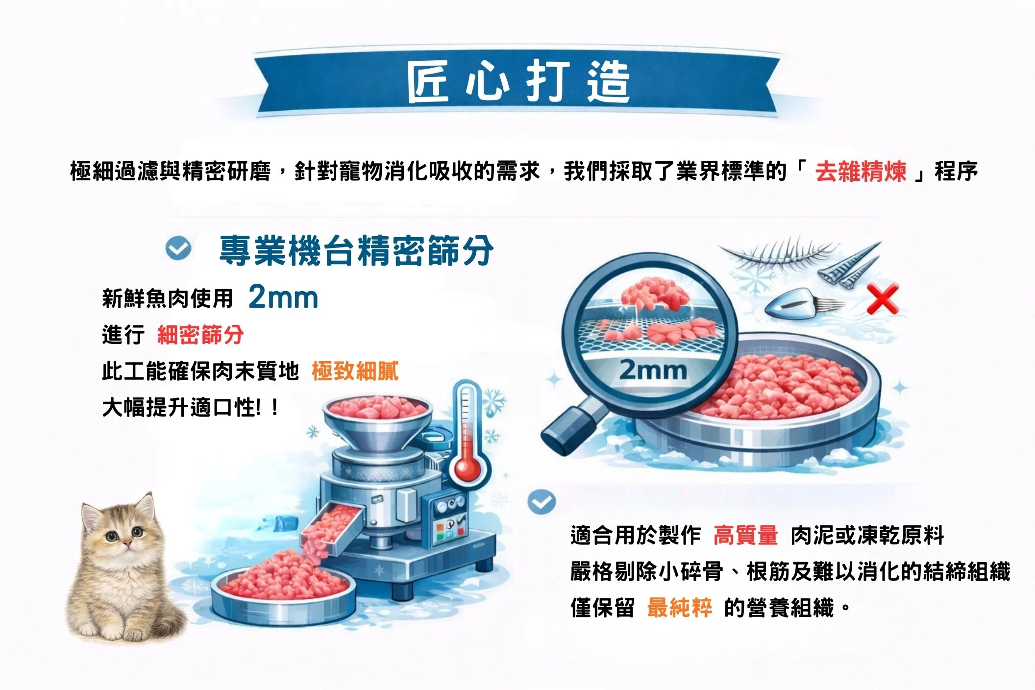 專業機台精密篩分:新鮮肉末於採收再使用2mm 進行細密篩分,此工能確保肉末質地 極致細膩,大幅提升適口性