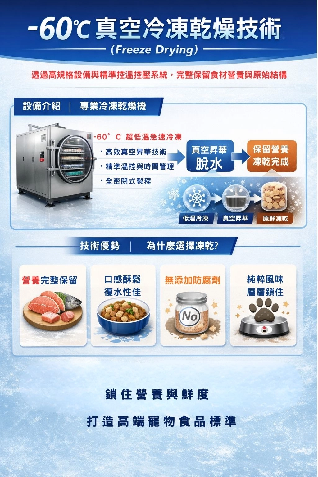 提供 -60℃ 真空冷凍乾燥技術,專業承接寵物零食食品代工服務