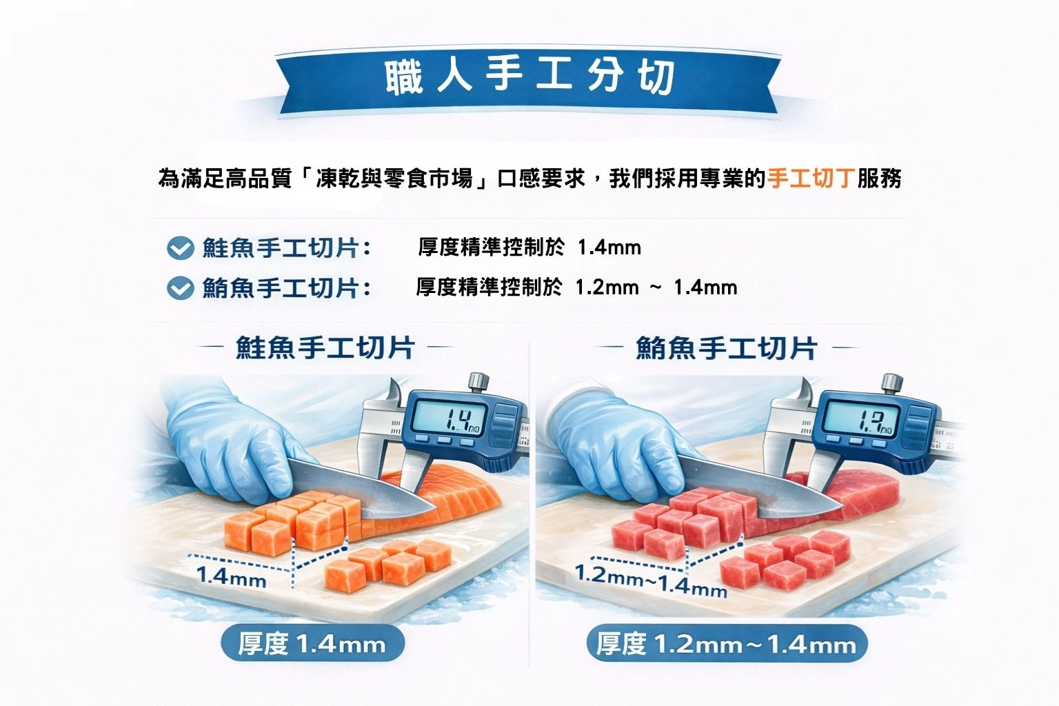 為滿足高品質「凍乾與零食市場」口感要求,我們採用專業的手工與切丁服務